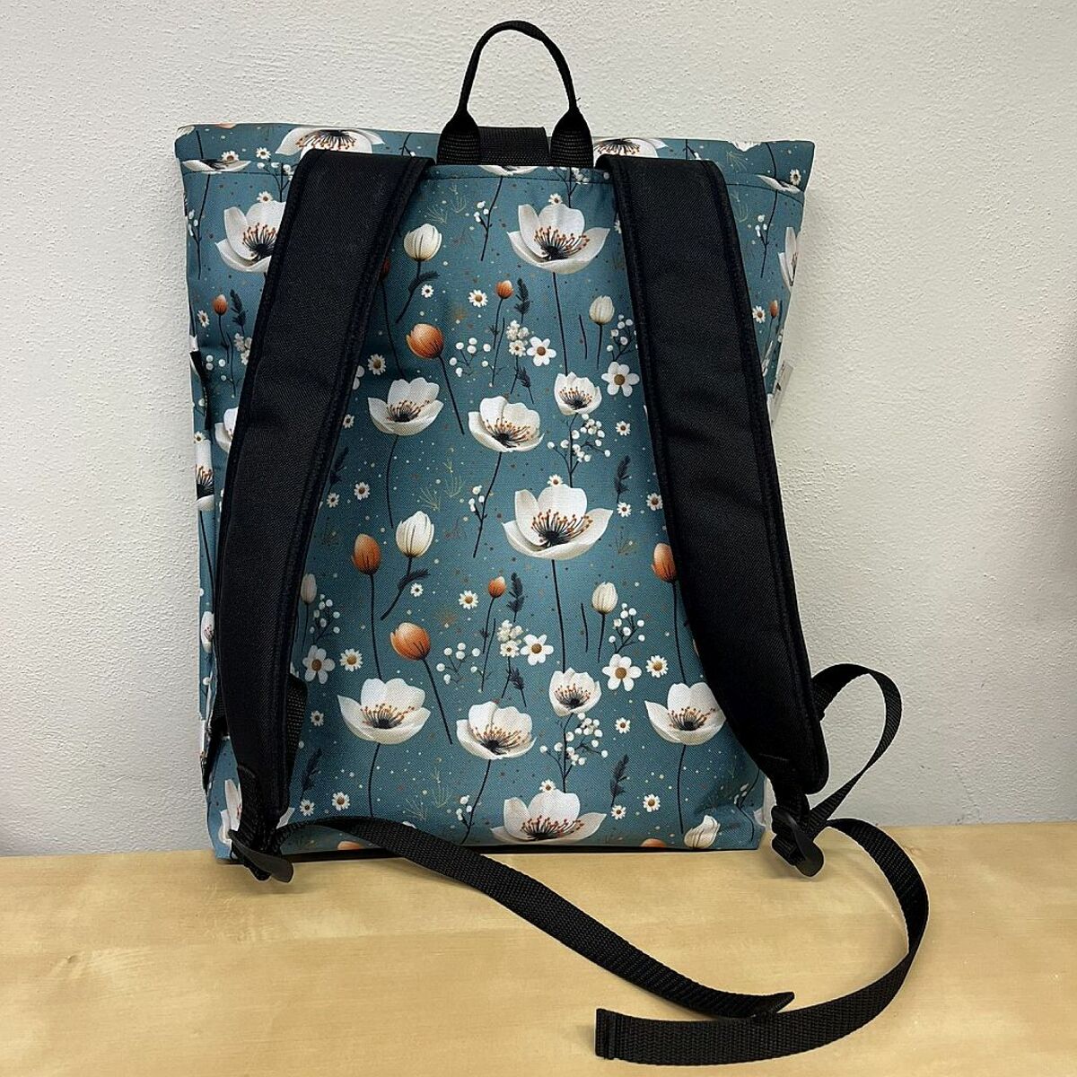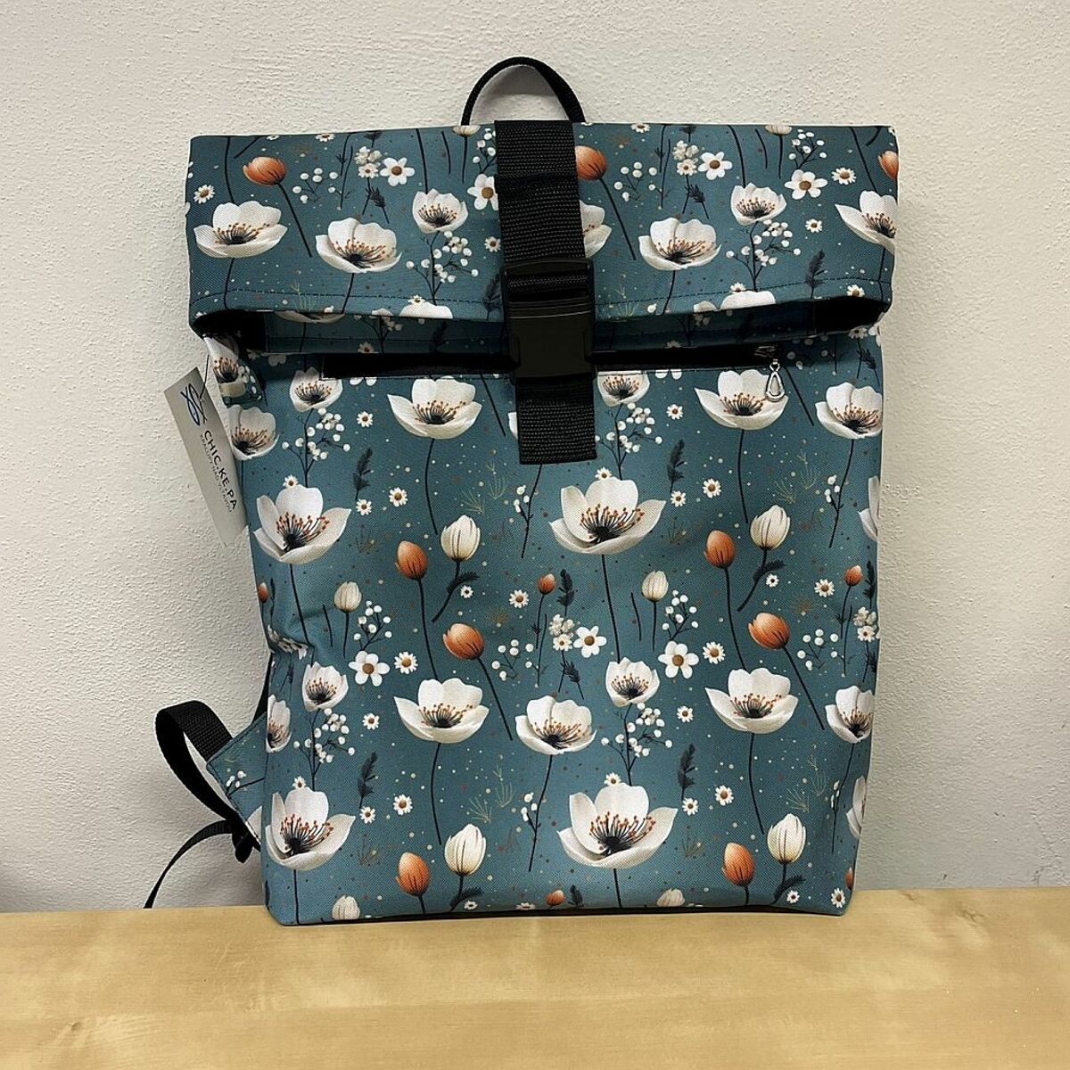 Stylový a praktický městský rolovací batoh z voděodolné látky s bílými máky. Batoh je ručně ušitý v šicí dílně Charity Kralupy nad Vltavou, a jeho koupí tak podpoříte smysluplnou práci a lokální výrobu.