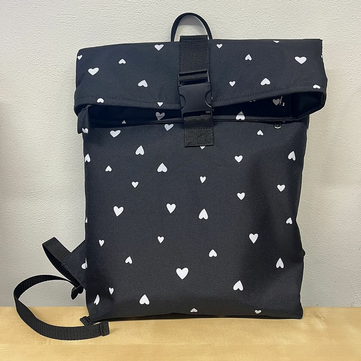Stylový a praktický městský rolovací batoh z voděodolné látky s motivem srdíček. Batoh je ručně ušitý v šicí dílně Charity Kralupy nad Vltavou, a jeho koupí tak podpoříte smysluplnou práci a lokální výrobu.
